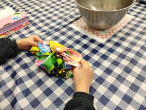 一生懸命作ったバスボムを風呂敷で包んで持って帰れるように、包み方を何パターンか教えていただきました。