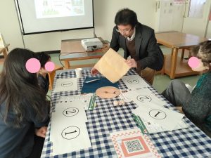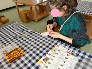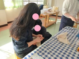 最初に今回使用する木糸のハンカチが何から出来ているのかなどの説明や、クイズを交えながら楽しく間伐材について学びました。
