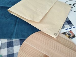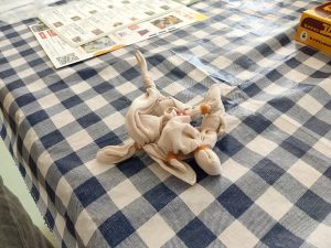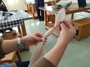 間伐材が生まれ変わってできた木糸のハンカチをまずは輪ゴムで好きな形に結びました。
