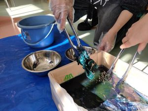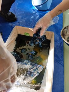 結んだハンカチを染料に浸けていきます。色がだんだん変わっていくのがとてもきれいで皆さん感動されていました。