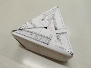 | 内容 | A4サイズのチラシなどの古紙を使用して、三角形の蓋つき箱を折ります。